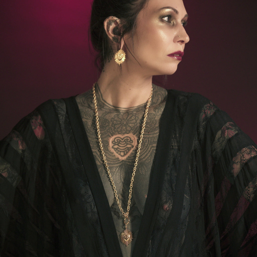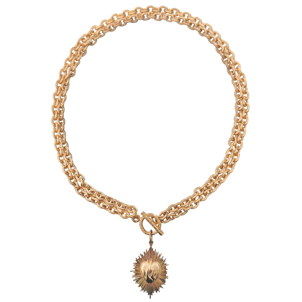 Fermoir toggle gravé orné d'un médaillon en forme de coeur sacré représentant l'élément 'Feu' monté sur une épaisse double chaîne à maillons ovals gravés. Le collier peut se porter de 2 façons différentes : en version courte avec le double rang de chaînes, ou bien en version sautoir avec un seul rang de chaîne.